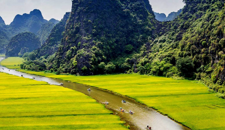 - 13:30 Lên thuyền nhỏ để tham quan Tam Cốc (đi thuyền 1.5 giờ). Với tầm nhìn ra những vách đá vôi hùng vĩ và hang động bí ẩn, cũng như phong cảnh đồng quê như dòng suối hiền hòa, cánh đồng lúa và cánh đồng xanh hoang vắng, Tam Cốc thực sự có tất cả. Bạn sẽ cảm nhận được bầu không khí trong lành và những khoảnh khắc yên bình, cơ hội rất tốt cho những người yêu ảnh, thả hồn vào những khoảnh khắc và khung cảnh đặc biệt.
