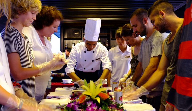 17:30: Trở về du thuyền, quý khách thư giãn trên sân thượng, săn hoàng hôn, thưởng thức đồ uống cùng chương trình Giờ hạnh phúc (mua 1 tặng 1) hoặc vui vẻ cùng lớp nấu ăn trong khi du thuyền di chuyển tới khu vực Lờm Bò.