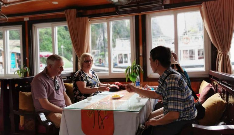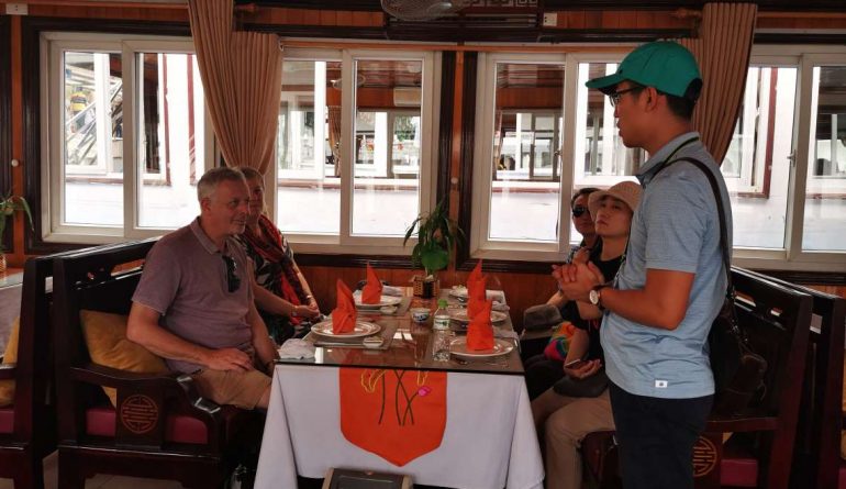 - 12:00:Đến Cảng Tuần Châu, chào mừng quý khách lên tàu và giới thiệu sơ lược về Du thuyền, những con đường nổi bật, những hòn đảo không có người ở và những mỏm đá đã được người dân địa phương đặt cho những cái tên đầy trí tưởng tượng, do hình dáng của chúng, bao gồm cả Gà chọi, thưởng thức bữa trưa trên thuyền.