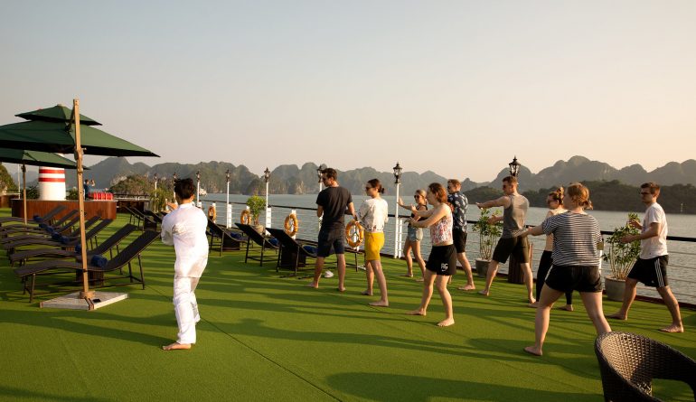 6:15: Du khách ngắm bình minh trên vịnh, tham gia Tai Chi class – Lớp học Thái cực quyền với hướng dẫn viên trên tàu, thưởng thức bầu không khí trong lành trên Vịnh Lan Hạ.
