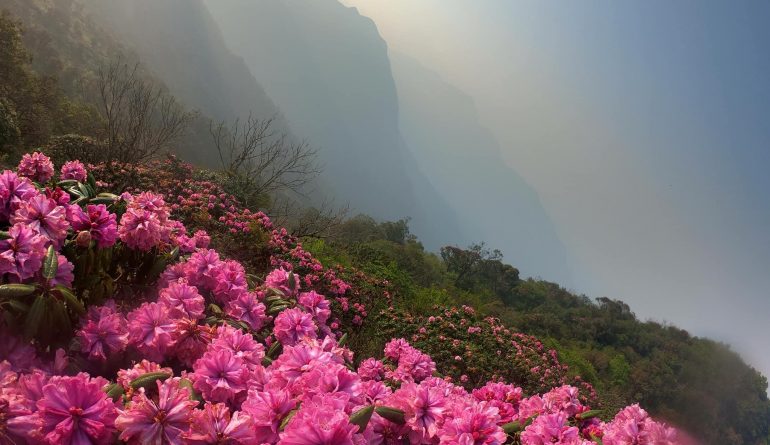 Và đặc biệt, nếu bạn tới Pu Ta Leng mùa xuân, khi hoa đỗ quyên nở, sẽ thấy khu rừng này bừng sắc hồng đỏ tuyệt đẹp. Có những đoạn đường đỗ quyên nở rực rỡ còn hoa thì rụng phủ kín những lối đi.