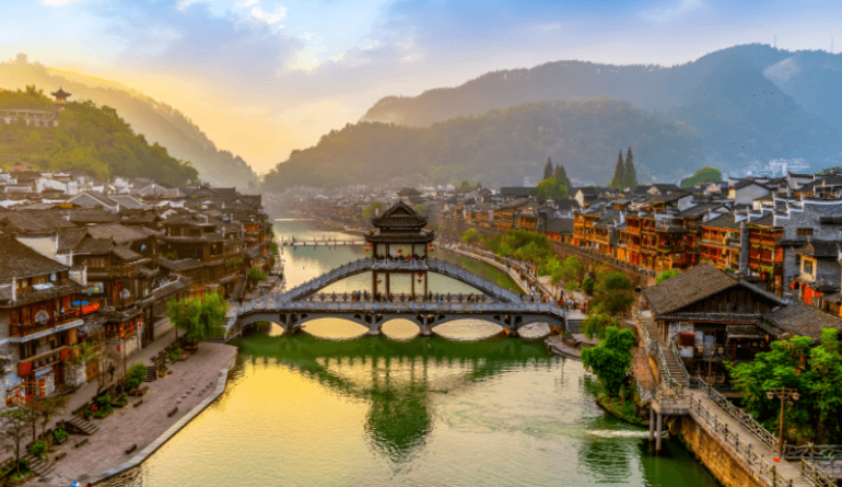 Cổ Trấn Phượng Hoàng nằm ở phía Tây tỉnh Hồ Nam – Trung Quốc, có lịch sử hơn 1300 năm và là nơi sinh sống của nhiều dân tộc thiểu số , được gọi là Phượng Hoàng vì bao quanh cổ trấn có ngọn núi dáng trông giống một con phượng hoàng bay lên. Cổ trấn có kiến trúc cổ kính, trầm mạc thơ mộng trải dài hơn 10km2 đường lát đá hàng trăm năm tuổi nằm bên cạnh dòng sông Đà Giang đây là điểm đến lý tưởng cho du khách thưởng ngoạn.