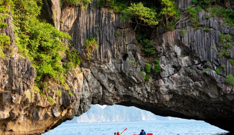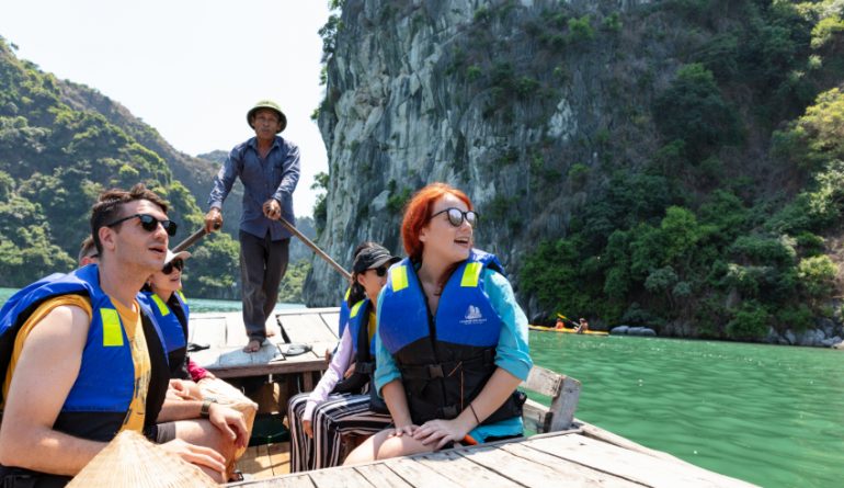 08:30-09:00 Du thuyền nhỏ đón quý khách đi xuyên qua Vịnh Lan Hạ để bến đò làng Việt Hải
